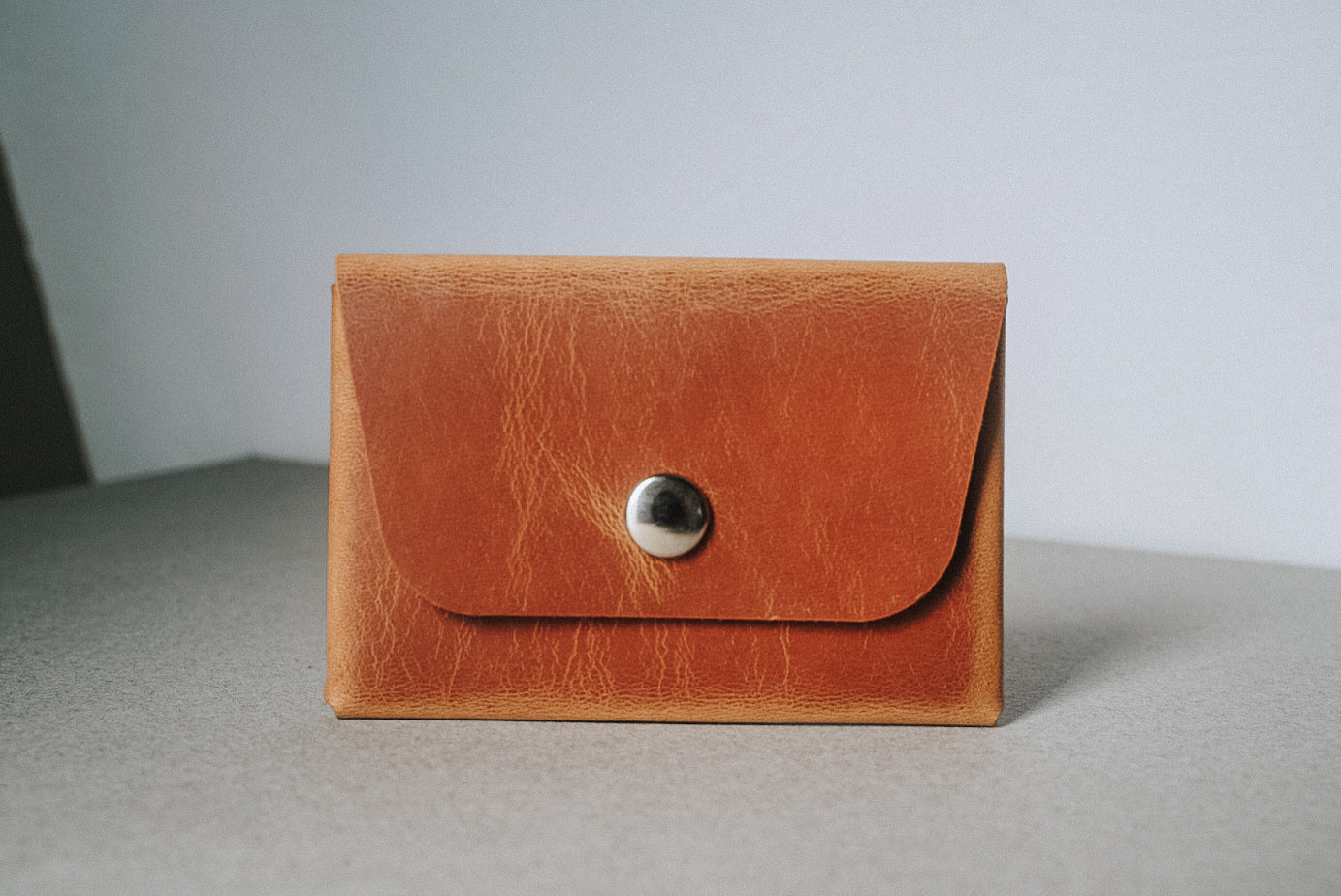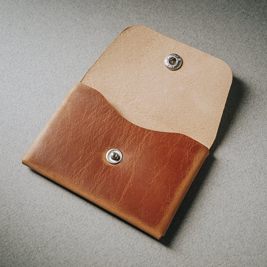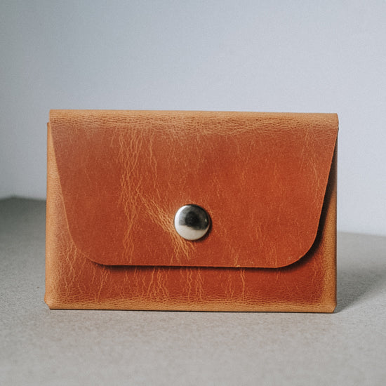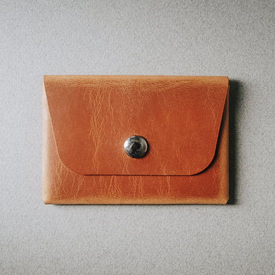 This cardholder is made from brown waxy vegetable tanned leather and has a lot of visual character that will develop with daily use.