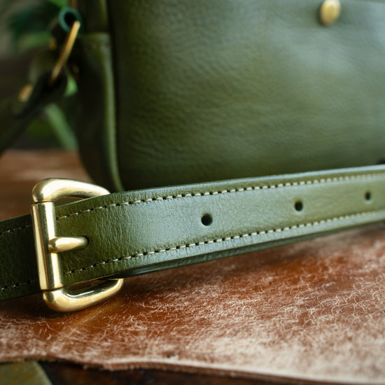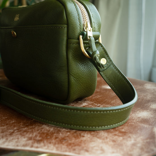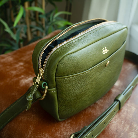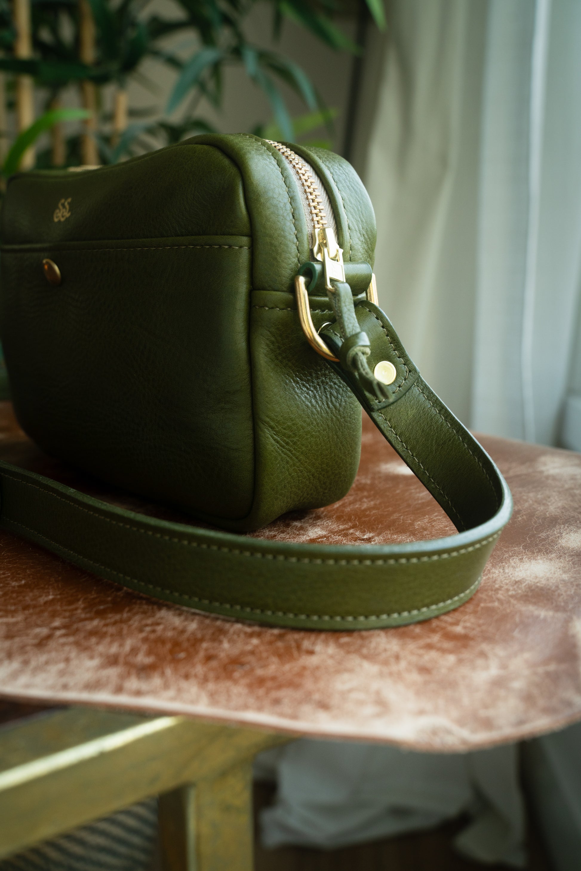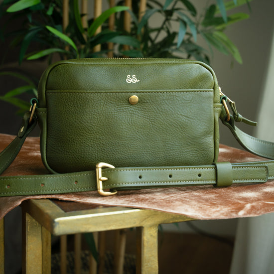 This S.S. Cross Body Bag is made from the beautiful premium Italian Vegetable tannned leather, Minerva Box, from Tuscany Italy. The bag can be worn as a crossbody or comfortably over the shoulder as a traditional purse. The bag measures approximately 9” wide by 6” tall by 3” deep.