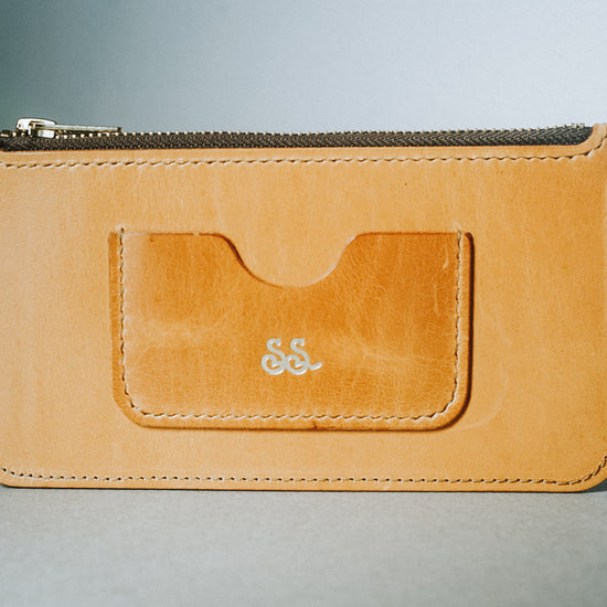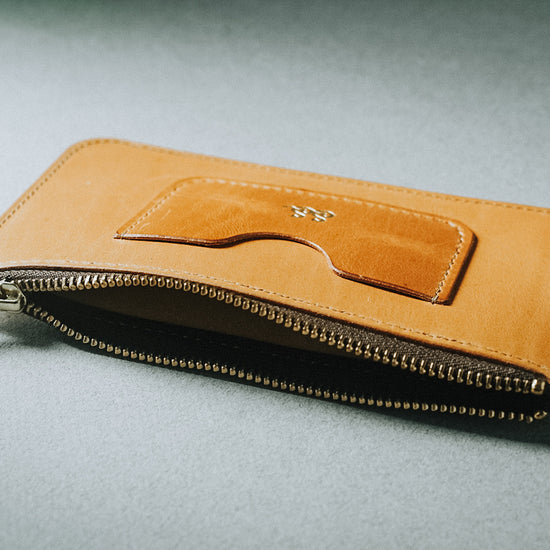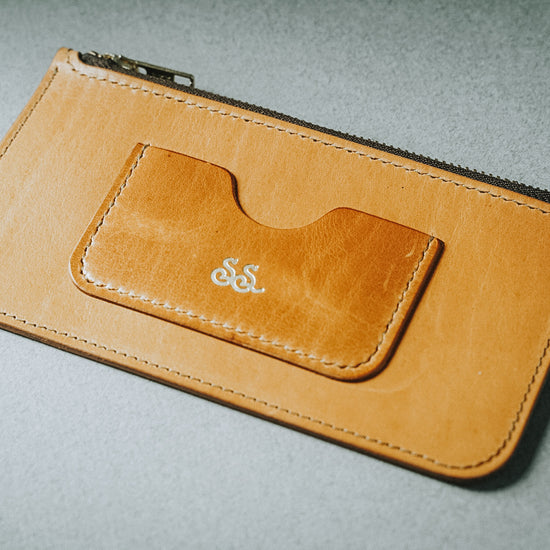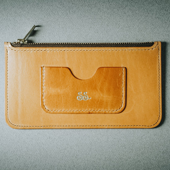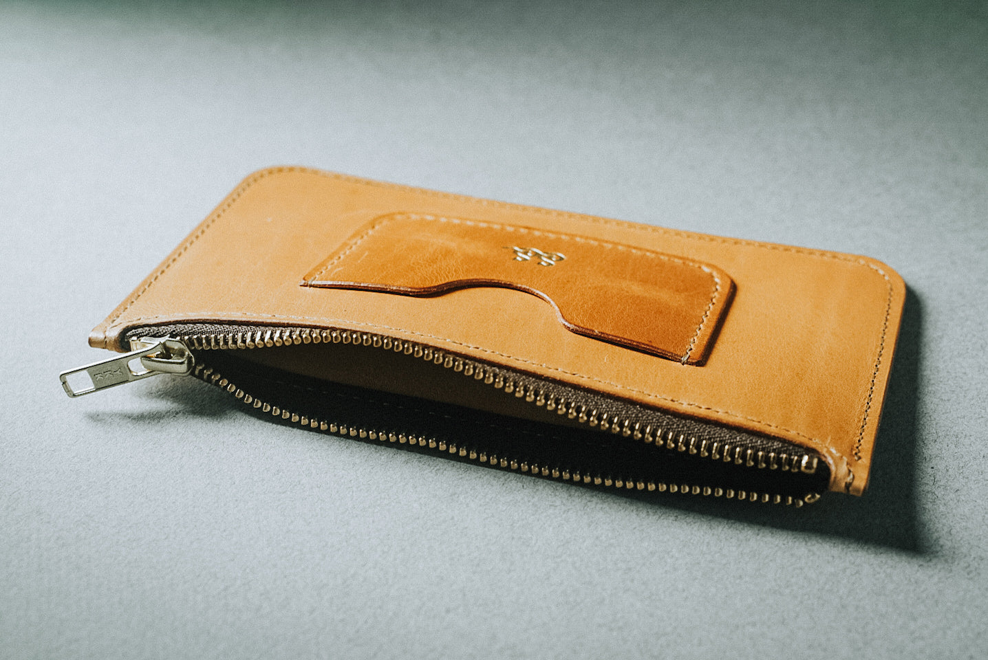 The minimalist clutch is an ideal carry for those who know exactly what their outing looks like and what they need to carry. The clutch has an exterior cardholder to carry your most used card(s) and a zippered space for cash, receipts, lip gloss and other feminine products. This mini batch of clutches is made from a beautiful natural Guacho Oil from La Bretagna in Tuscany Italy.