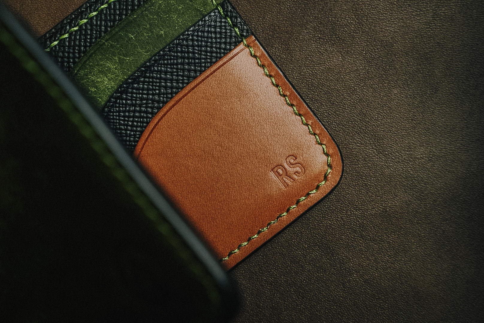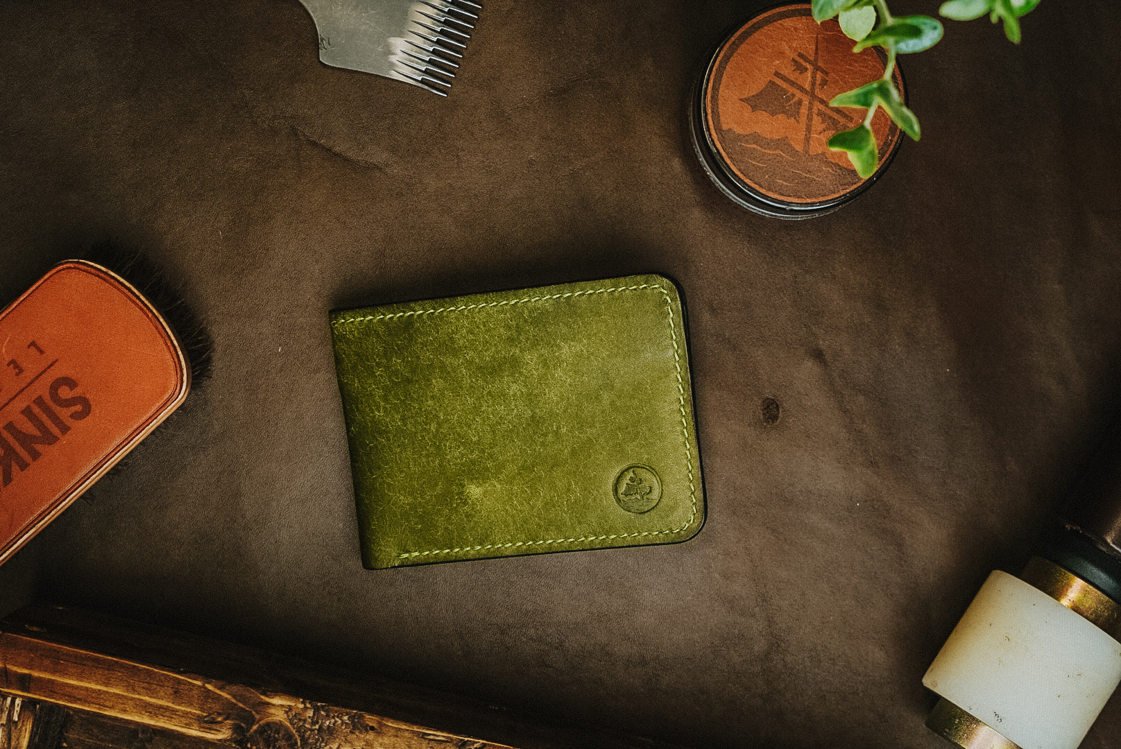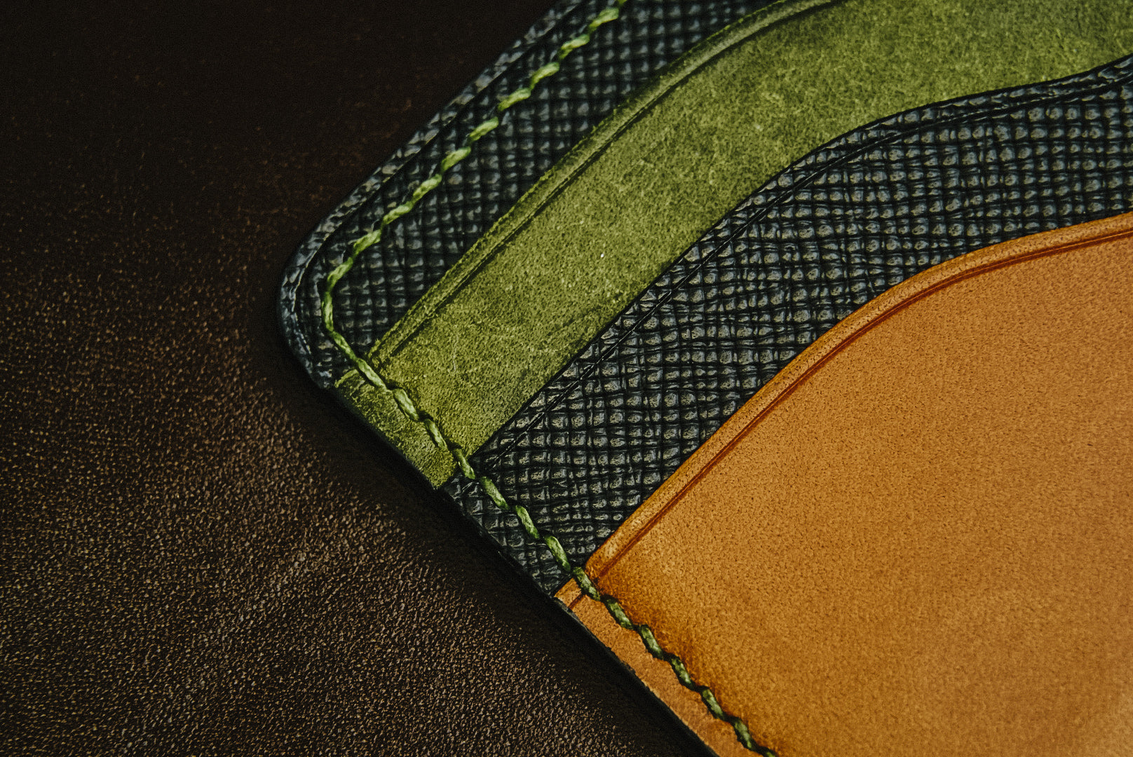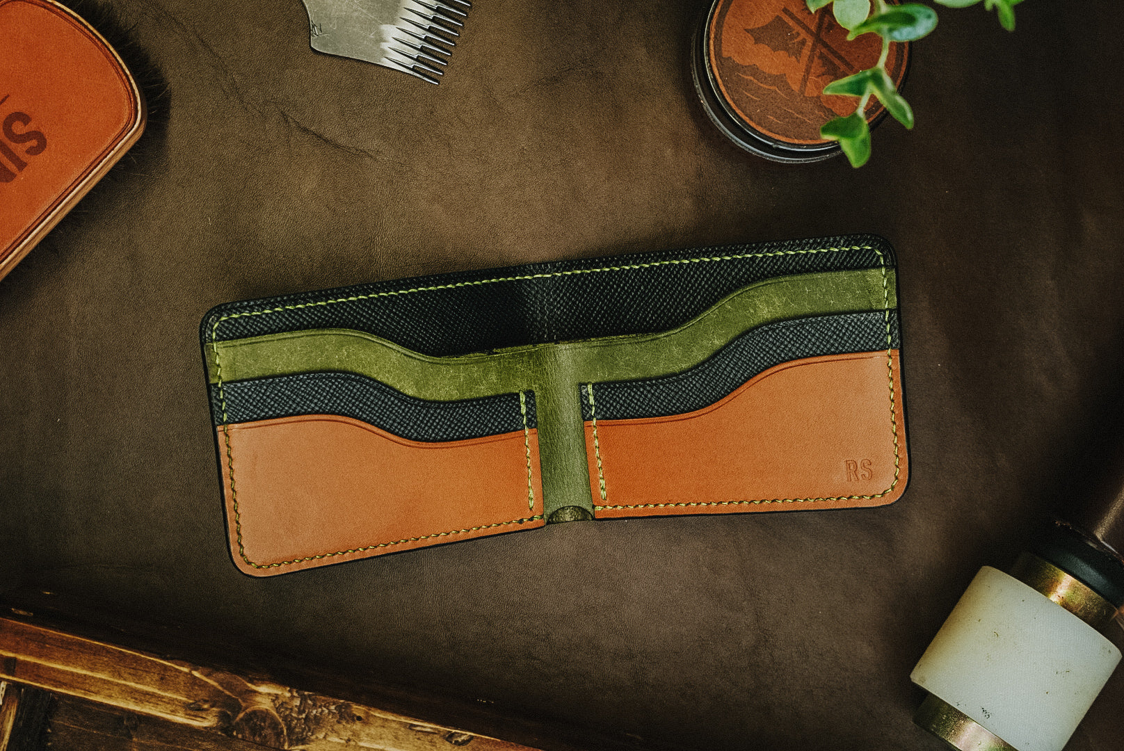 Wallet seen here is made from Olive Pueblo vegetable tanned leather along with an interior comprised of black hatch Buttero/olive Pueblo & whiskey Buttero.