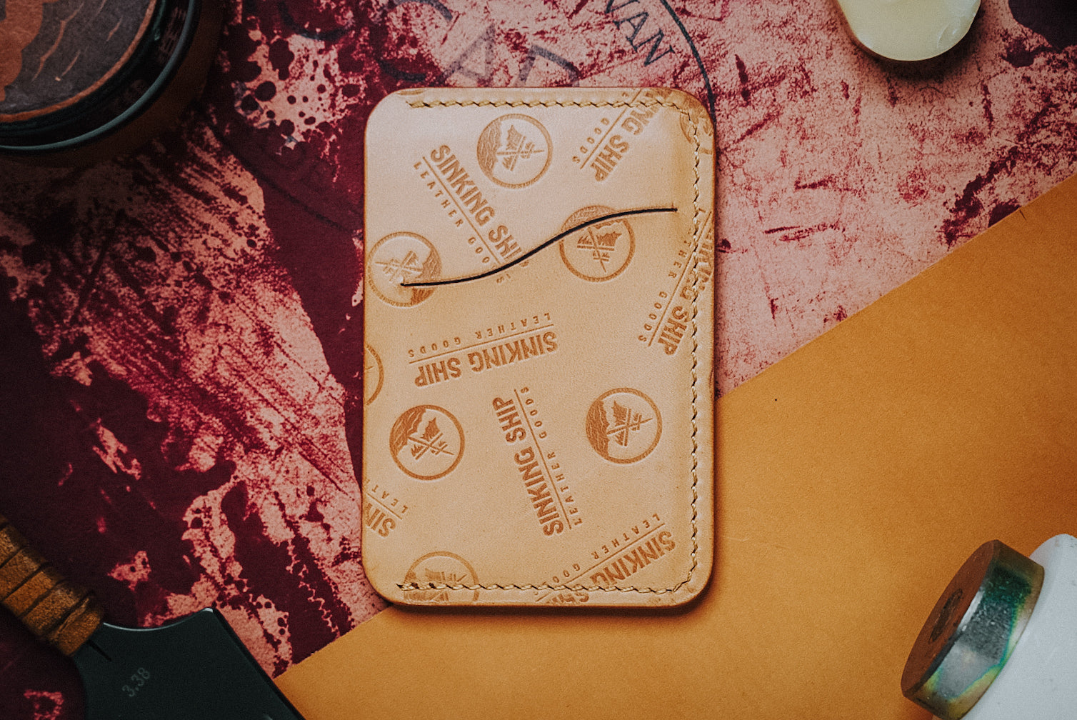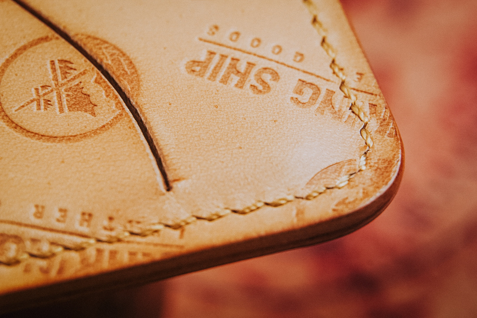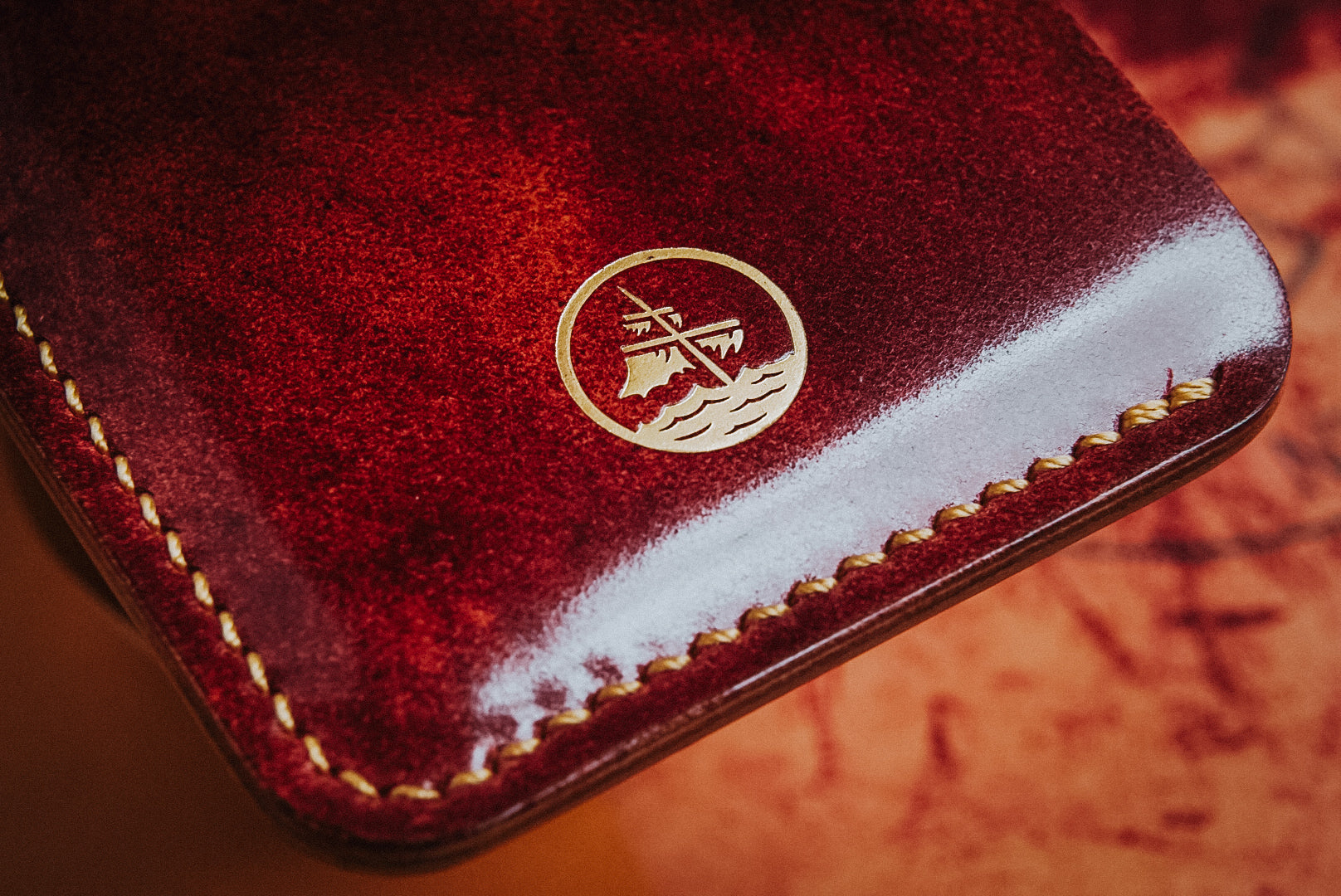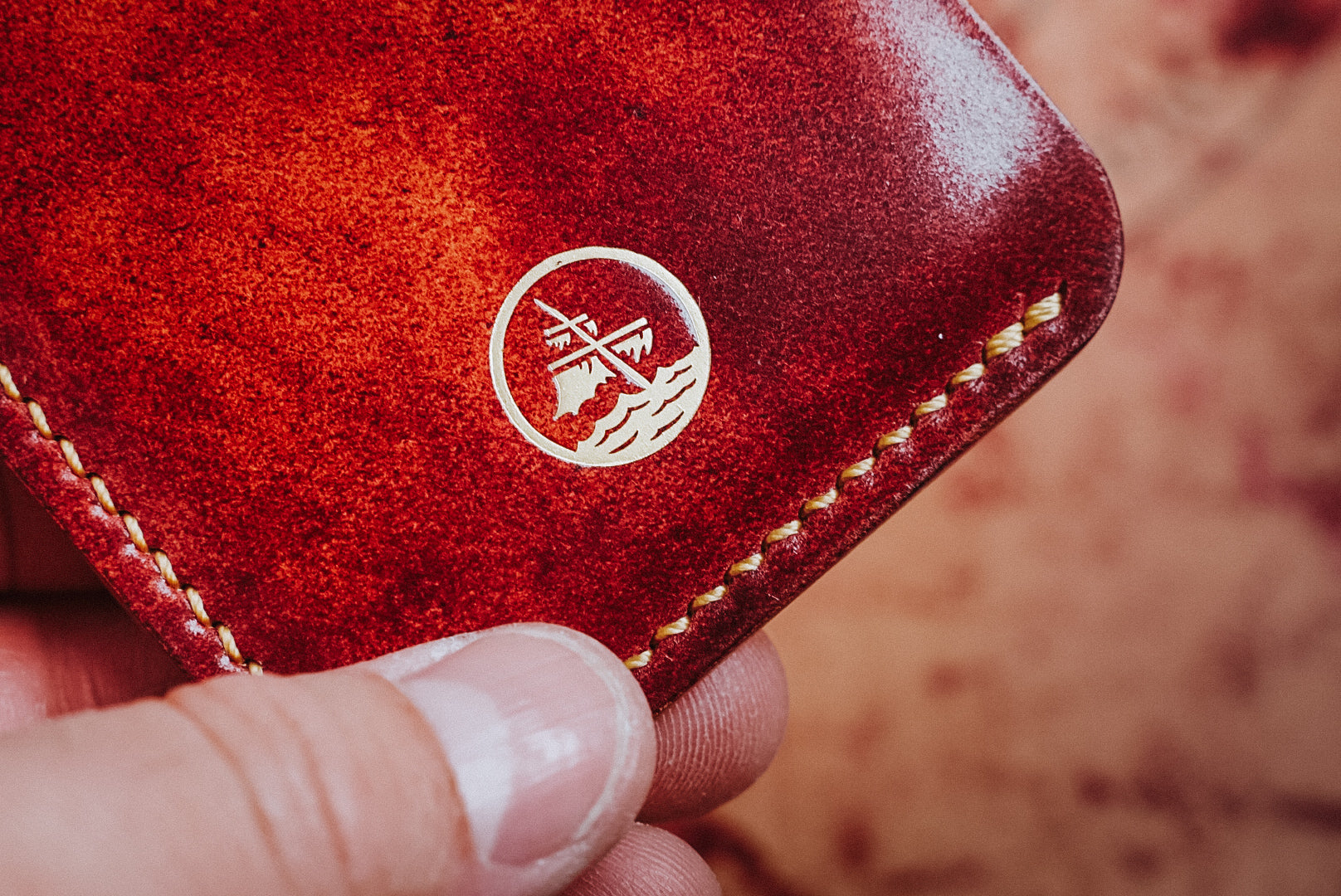 This wallet is made from Rubino Rocado Shell Cordovan (front) and natural Buttero (back). Not only is every marbled shell unique, but add some logo